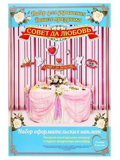 Набор свадебных наклеек для оформления интерьера (154900) K010176 Набор красивых декоративных элементов. которые крепятся к поверхности на двухсторонний скотч. После отклеивания не остается следов. Наклейки выполнены в свадебном стиле, на них изображены голуби, сердца, бокалы и надпись "Совет да Любовь". Материал: картон Размер: 21 х 31 см Наклеек в наборе: 8 шт. Мин. заказ 500 руб.