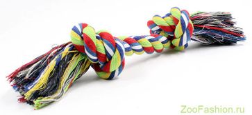 Игрушка в виде каната с двумя завязанными узлами на концах, разноцветная. Специальная форма позволяет тренировать и развивать челюсть собаки. Игрушка предназначена для игр с собакой любого возраста. None