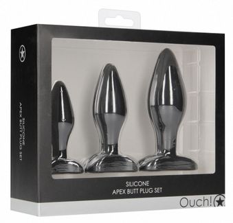 Apex Butt Plug Set - набор из трех анальных пробок разного размера, которые сделаны из шелковистого силикона, и заострены на конце для простого и удобного введения. Эти пробки имеют оригинальную конструкцию, обеспечивающую максимальную анальную стимуляцию, которая затрагивает все нужные места одновременно. Высококачественные материалы, не содержащие фталатов, обеспечат насыщенные и гарантировано безопасные тактильные ощущения. Анальная пробка вставляется в анус после предварительной подготовки. Длина большой втулки - 11,7 см., диаметр - 3,5 см.<br> Длина средней втулки - 10 см., диаметр - 2,9 см.<br> Длина малой втулки - 8,3 см., диаметр - 2,3 см.<br> None