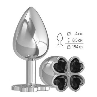 Серебристая анальная пробка-клевер с черным кристаллом - 9,5 см. (119444)