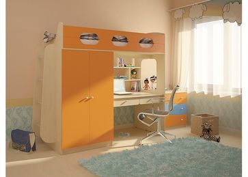 Детская комната Киндер-Каприз - это компактный, многофункциональный детский комплекс, который займет минимум пространства и при этом сэкономит Ваш бюджет.Комплектация: Комплекс состоит из спального места, шкафа и стола с выдвижными ящиками (без тумбы).Шкаф: платяное отделение со штангой, и отделения с полками 3 шт. Удобный стол с книжными полками и световым окном, позволяет грамотно организовать рабочее пространство. Выдвижные ящики стола создают дополнительную возможность иметь все самое необходимое под рукой.Надежная лестница позволит ребенку легко забраться в кровать.Взаимное расположение (справа или слева) стола и шкафа можно выбрать при сборке.Скругления и радиусные скосы обеспечат безопасность Вашему ребенку.Бортик безопасности имеет эргономичный и безопасный вырез для доступа к спальному месту.Используемые материалы:Корпус и фасад изделия выполнен из ламинированной ДСП, изготовленной по зарубежным технологиям. Этот материал соответствует ГОСТу и разрешен к использованию в учреждениях для детей дошкольного возраста.Для модели «КИНДЕР-КАПРИЗ» используется фурнитура ведущих производителей, таких как HETTICH, GAMET и др., что гарантирует надежность и долговечность работы всех подвижных деталей.Характеристики: