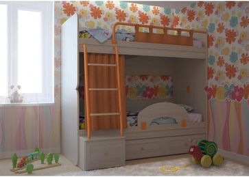 При двухъярусном размещении кроватей металлическая лестница с деревянными ступенями расположена на фасаде