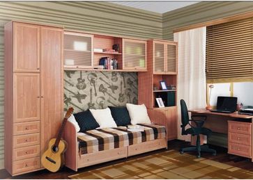 Модульная мебель "ОЛИМП" — это кровати, платяные и книжные шкафы, пеналы, навесные полки, компьютерные столы, комоды и др. При этом каждый элемент можно выбрать в различном исполнении: платяной шкаф обычный или угловой, книжный шкаф или пенал (открытый или закрытый), с выдвижными ящиками или с полками, с обычными или со стеклянными дверцами, несколько вариантов кроватей, комодов, компьютерных столов, книжных полок. Таким образом количество возможных сочетаний и комбинаций огромно и может удовлетворить любые потребности.