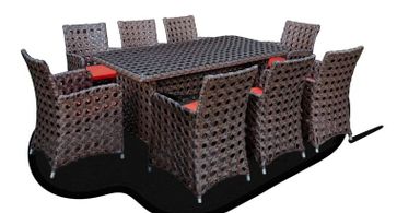 Комплект из искусственного ротанга Абруццо состоит из стола прямоугольной формы и 8-и кресел. Стол со стеклом. Подушки на кресла в комплекте. Размеры кресла ШхВхГ (мм):650х900х500 Размеры стола ДхВхШ (мм): 1800х750х800 Возможные цвета: коричневый Минимальная сумма заказа 1000 рублей. Возможен самовывоз.