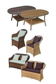 Комплект из искусственного ротанга Лацио состоит из дивана, 2-х кресел и столика овальной формы. Подушки в комплекте. Размеры кресла ШхВхГ, мм: 650х850х500 Размеры дивана ДхВхШ, мм: 1250х850х500 Размеры столика ДхШ мм: 1000х600 Возможные цвета: желтый, коричневый Минимальная сумма заказа 1000 рублей. Возможен самовывоз.