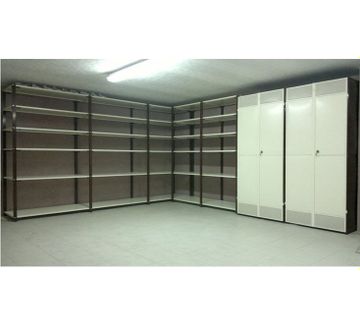 Стойки труба профильная прямоугольного сечения, полки каркас труба профильная квадратного сечения обшиты листом металла. Равно распределенная нагрузка на полку до 300 кг. Стеллаж имеет по 6 полок в каждой секции. Сборка стеллажа происходит при помощи болтового соединения. Изделие на регулируемых опорах для выравнивания по плоскости. Стеллаж покрашен полимерно-порошковой краской по таблице RAL стойки 8016 полки 1013 mat.