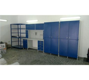 - лист металла 3мм. накрыт коробом. Стол трехтумбовый. Левая тумба имеет один мелкий выдвижной ящик под инструмент и распашную дверь на замке, за дверью расположены 2 полки. Правые две тумбы имеют 3 мелких и 2 глубоких ящика. Выдвижения ящиков происходит при помощи телескопических направляющих. Габаритный размер изделия: 21006502100. Изделие окрашено в полимерно-порошковую краску двух цветов по таблице RAL. между тумбами расположена полка под инвентарь. Изделие на регулируемых опорах для выравнивания по плоскости.Цена: от 33 308 руб.