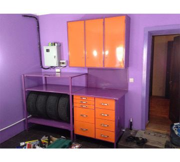 Стеллаж металлический сборно-разборныйСтойки стеллажа труба профильная прямоугольного сечения, полки каркас труба профильная квадратного сечения обшиты листом металла. Стойки стеллажа на регулируемых опорах для выравнивания по плоскости. Нижней отсек стеллажа предусмотрен под резину. Покраска изделия полимерно – порошковая по таблице RAL 4001.Цена: от 21 190 руб.Верстак слесарный двухтумбовыйСтолешница влагостойкая фанера 24мм. накрыта коробом металла 1 мм. Каркас стола выполнен из трубы профильной квадратного сечения обшит листом металла. Правая и левая тумба имеет выдвижные ящики 3 мелких и 2 глубоких, выдвижение ящиков происходит при помощи телескопических направляющих. Верстак на регулируемых опорах для выравнивания по плоскости. Покраска изделия полимерно – порошковая по таблице RAL корпус 4001 ящики 2008.Цена: от 29 758 руб.Защитный экран к верстакуКаркас труба профильная квадратного сечения обшит листом перфорации. Крепиться на столешницу стола при помощи болтового соединения. Покраска изделия полимерно – порошковая по таблице RAL 4001.Цена: от 2 443 руб.Антресоль металлическая навеснаяКаркас изделия труба профильная квадратного сечения обшита листом металла. Антресоль имеет три разделенные секции по 2 полки в каждой секции + дно антресоли. Двери распашные на фиксаторах. Изделие крепится на анкерные болты к стене. Покраска изделия полимерно – порошковая по таблице RAL корпус 4001 дверки 2008.Цена: от 17 058 руб. None Возможен самовывоз. Есть доставка.