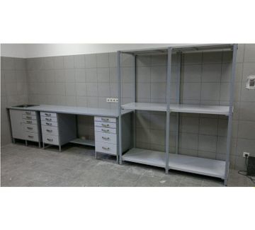 Верстак слесарный металлический двухтумбовыйКаркас изделия выполнен из профильной трубы квадратного сечения, обшит листом металла. Левая и правая тумба верстака имеет пять выдвижных ящиков под инструмент. Три мелких ящика и два больших ящика. Ящики выдвигаются при помощи шариковых телескопических направляющих, меж - тумбовое подверстачье имеет полку глубиной 250 мм. Столешница влагостойкая фанера 24 мм. + лист металла 2 мм. Регулируемые опоры у изделия позволяют выравнивать верстак по плоскости. Покраска полимерно-порошковая по таблице RAL: корпус - 7040, ящики - 7047.Цена: от 35 411 руб.Верстак слесарный металлический двухтумбовыйКаркас изделия выполнен из профильной трубы квадратного сечения, обшит листом металла. Левая тумба верстака имеет распашную дверь на замке и нижнею полку, в правой тумбе пять выдвижных ящиков под инструмент. Три мелких ящика и два больших ящика. Ящики выдвигаются при помощи шариковых телескопических направляющих. Столешница влагостойкая фанера 24 мм. + лист металла 2 мм., в левой части столешницы расположена раковина из нержавеющей стали. Регулируемые опоры у изделия позволяют выравнивать верстак по плоскости. Покраска полимерно-порошковая по таблице RAL: корпус - 7040, ящики - 7047.Цена: от 29 951 руб.Стеллаж сборно-разборный двухсекционныйСтойки труба профильная прямоугольного сечения, полки труба профильная квадратного сечения обшиты листом металла. В стеллаже предусмотрены три полки. Изделия имеют регулируемые опоры для выравнивания по плоскости. Покраска полимерно-порошковая корпус по таблице RAL: стойки - 7040, полки - 7047.Цена за секцию: от 17 330 руб. None Возможен самовывоз. Есть доставка.