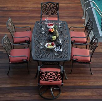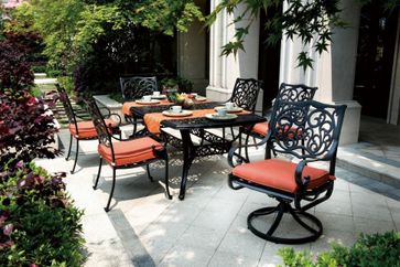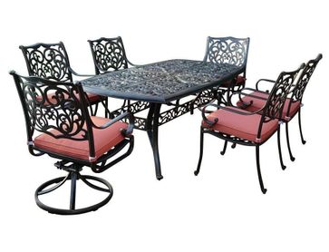 Комплект садовой мебели из литого алюминия Барселона состоит из стола, 4-х кресел и 2-х вращающихся кресел с подушками. Материалы: литой алюминий Размеры (ШхВхГ), мм: стол: 2140х730х1120 кресло: 600х950х705 вращающееся кресло: 600х950х705 Цвет: как на фото Минимальная сумма заказа 1000 рублей. Страна производства: Китай Возможен самовывоз.
