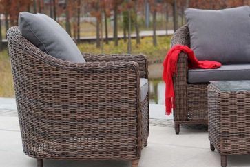 Подушки выполнены из водостойкой полиэфирной ткани для защиты мебели от дождя и солнца