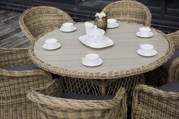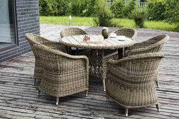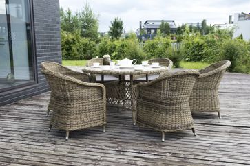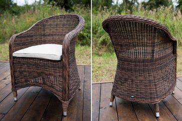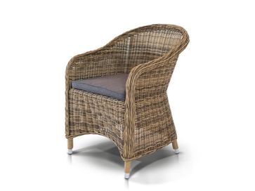 Кресло Равенна из искусственного ротанга оригинальной формы с подлокотниками. Кресло комплектуется подушкой со съемным чехлом серо-коричневого цвета для максимального комфорта. Каркас изделия выполнен из прочного алюминия, ножки оплетены ротангом, что гарантирует продолжительный срок службы модели. В солнечных лучах плетение приобретает более светлый и яркий оттенок. Кресло Равенна - оригинальное сочетание природных мотивов, современного стиля и практичности.