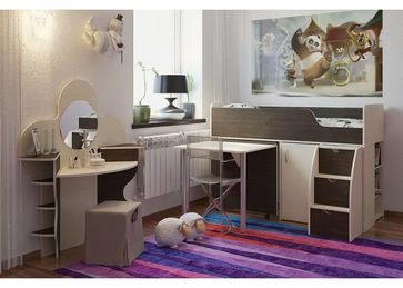 Кровать-чердак Орбита-19 от фабрики "Мебель Кострома". Кровать производится из Австрийского ЛДСП завода Egger (лучший производитель) толщиной 16 мм.Все лицевые детали обрабатываются кромкой ПВХ толщиной 2 мм, остальные детали покрываются кромкой 0,4 мм.Мебель Орбита-19 -может собирать так, что бы стол был с правой стороны или с левой стороны (универсальная сборка)