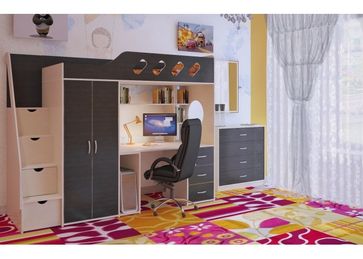 Кровать-чердак Орбита-21 Гранд с тумбой-лестницей. Кровать производится из Австрийского ЛДСП завода Egger (лучший производитель) толщиной 16 мм. Детали обрабатываются кромкой ПВХ толщиной 0,4мм. Детали дна кровати обработаны 2 мм. Кровать Орбита-21 -может собирать так, что бы стол был с правой стороны или с левой стороны.Лестница имеет два выдвижных ящика. Глубина ящика 30 см. Открывается на шариковых направляющих полного выдвижения. Два верхних отделения у лестницы глухие.