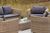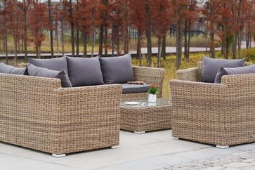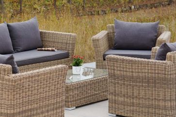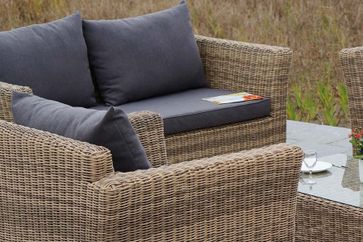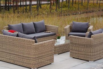 В комплект лаунж зоны входит один трехместный диван, один двухместный диван, два кресла, журнальный столик и подушки.