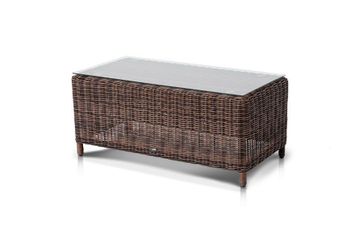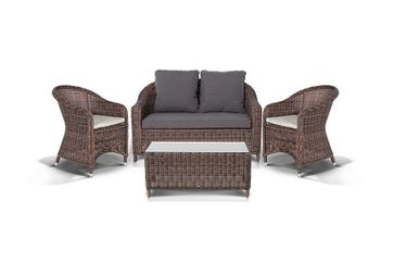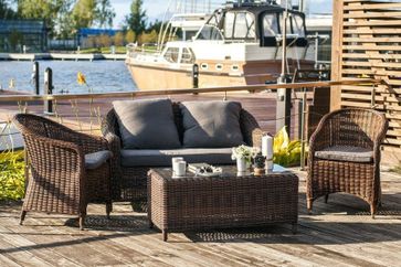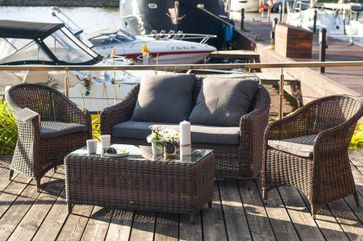 Лаунж зона Кон Панна С изготовлена из высококачественного износостойкого искусственного ротанга темно-коричневого цвета. Имеет круглое плетение и прочный алюминиевый каркас с максимальной нагрузкой до 200 кг. Подходит для использования как на улице, так и в доме. Чехлы от подушек съемные, выполнены из водостойкой полиэфирной ткани. Ножки - алюминий. Столешница - крепкое закаленое стекло толщиной 5 мм. В комплектацию включены: