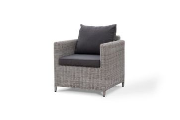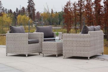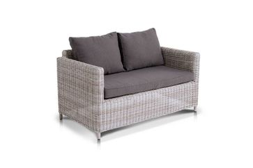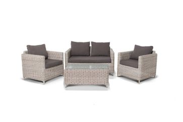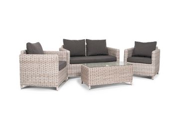 В комплект лаунж зоны Макиато Бьянко входит один двухместный диван, два кресла, журнальный столик и подушки.