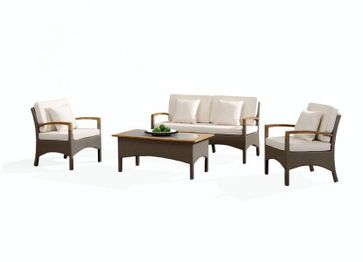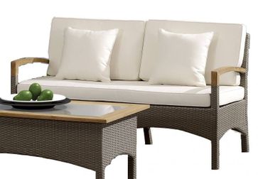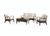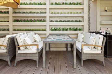 В комплект лаунж зоны входит один двухместный диван, два кресла, журнальный столик и подушки.