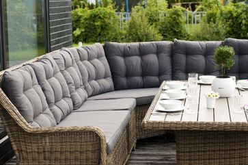 Левый модуль Бергамо изготовлен из круглого искусственного ротанга серо-желтого оттенка Достоинства данной модели: