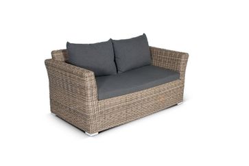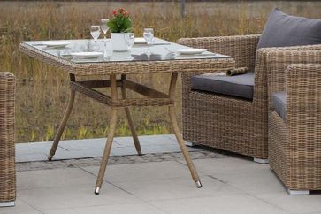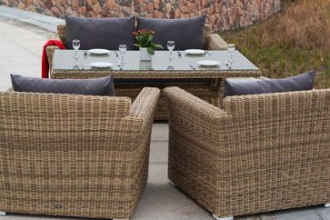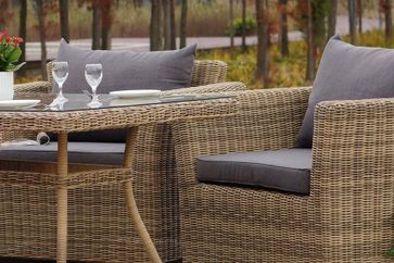 В комплект малой обеденной группы входит один обеденный стол, один двухместный диван, два кресла и подушки.