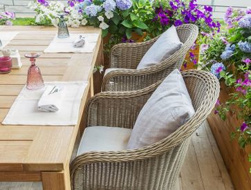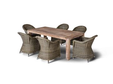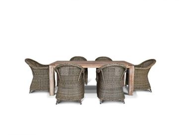 В комплект обеденной группы входит один обеденный стол, шесть стульев и подушки.