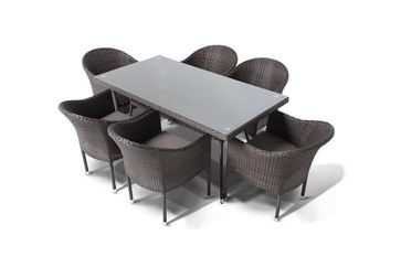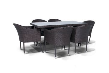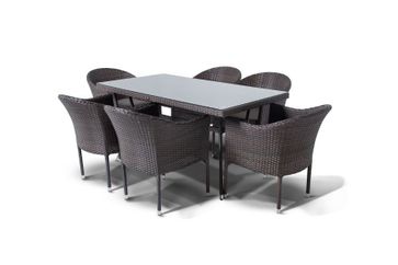 Обеденная группа Фраппе изготовлена из высококачественного искусственного ротанга темно-коричневого цвета. Имеет плоское ручное плетение и прочный алюминиевый каркас с максимальной нагрузкой до 200 кг. Поставляется в комплекте с подушками, которые выполнены из водостойкой полиэфирной ткани для защиты мебели от дождя и солнца. Столешница изготовлена из крепкого закаленного стекла толщиной 5 мм. В комплектацию включены: