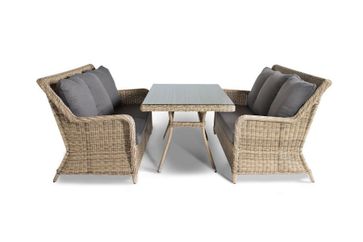 В комплект обеденной группы входит один обеденный стол, два трехместных дивана и подушки.