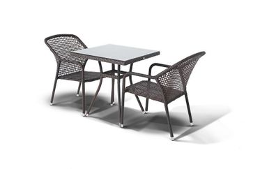 Обеденная группа Корто изготовлена из высококачественного искусственного ротанга коричневого цвета. Имеет плоское ручное плетение и прочный алюминиевый каркас с максимальной нагрузкой до 200 кг. Столешница - крепкое закаленное стекло толщиной 5 мм. Ножки отделаны алюминием. В комплектацию включены:
