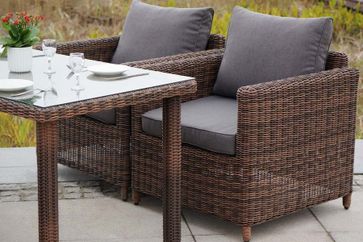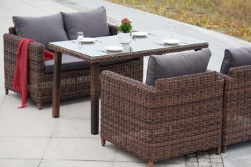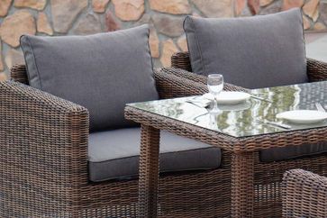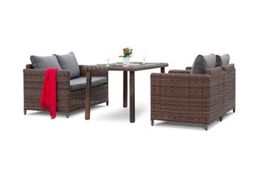 В комплект обеденной группы входит один обеденный стол, один двухместный диван, два кресла и подушки.