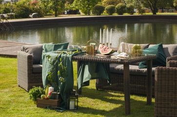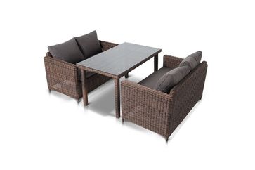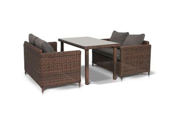 Обеденная группа Макиато Дабл изготовлена из высококачественного круглого искусственного ротанга коричневого цвета. Имеет ручное плетение и прочный алюминиевый каркас с максимальной нагрузкой до 200 кг. Подходит для использования как на улице, так и в доме. Чехлы от подушек съемные, выполнены из водостойкой полиэфирной ткани. Ножки - алюминий. Столешница - крепкое закаленое стекло толщиной 5 мм. В комплектацию включены: