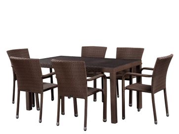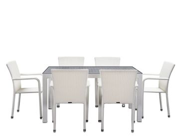 Каркас стола из алюминия с порошковым покрытием, оплетен плоским ротангом, закаленное стекло столешницы. Все столы, за исключением столов в сером цвете, имеют цельносваренный усиленный каркас. Серые разборные.Стулья имеют цельносваренный алюминиевый усиленный каркас, оплетены плоским ротангом. Цвета: белый, шоколадный, серыйГабариты:Стол 150х90х75 смСтулья 57х60х82 см Минимальная сумма заказа 1000 рублей. Страна производства: Россия Возможен самовывоз.