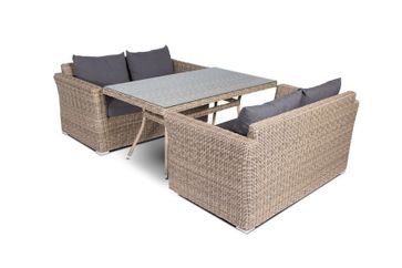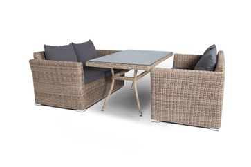 Комплект выполнен на алюминиевом каркасе в комбинации с круглым плетением из искусственного ротанга серо-жёлтого или темно-коричневого цвета, продается как комплектом, так и раздельно, разработано дизайнерской группой «4SiS», Италия.В комплект мебели входит 1 стол малый «Латте» и 2 дивана двухместных «Капучино».- размеры стола (ШхГхВ): 160х90х75 см., стеклянная столешница 5 мм.- размеры дивана (ШхГхВ): 170х85х81 см. подушки в комплекте None Возможен самовывоз. Есть доставка.