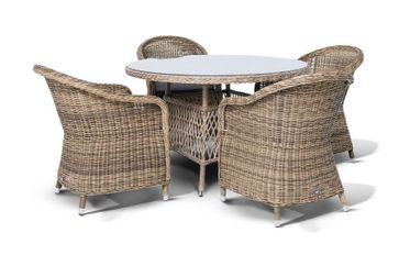Обеденная группа Равенна изготовлена из высококачественного искусственного ротанга соломенного цвета. Имеет круглое ручное плетение и прочный алюминиевый каркас с максимальной нагрузкой до 200 кг. Стулья с удобными подлокотниками и мягкими подушками отличаются повышенным удобством. Чехлы от подушек съемные, выполнены из водостойкой полиэфирной ткани. Столешница - крепкое закаленное стекло толщиной 5 мм. В комплектацию включены:
