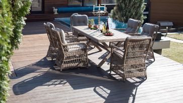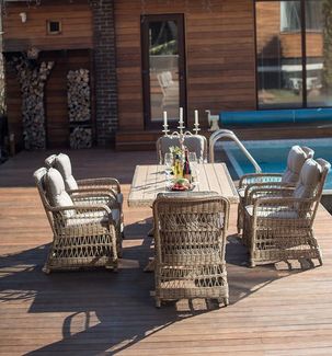 Комплектация: 1 обеденный стол, 6 кресел с подлокотниками и подушками