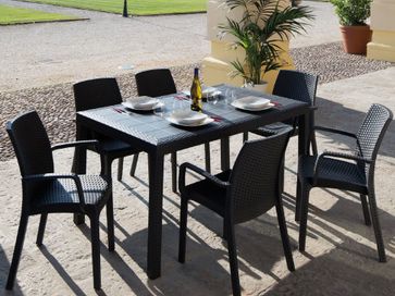 Обеденный комплект Indiana-Huston состоит из стола и 6-ти кресел. Комплект сделан из высокопрочного пластика - полипропилен, 100% имитация искусственного ротанга. Мебель, изготовленная из этого материала обладает высокой устойчивостью к перепадам температуры и влаги, не выгорает на солнце, выдерживает высокую нагрузку на сидения (120 кг). В мебели предусмотрены эргономичные подлокотники с отверстиями для стаканов. Комплект состоит из двух диванов, двух кресел и обеденного стола. Материал - полипропилен Подушки: холлофайбер (не впитывает влагу, чехол на молнии) Размеры (ШхВхГ), мм: Кресло - 570х860х590 Стол - 1500х740х900 Цвет: венге Данная мебель поставляется в разобранном виде!!! Минимальная сумма заказа 1000 рублей. Возможен самовывоз.