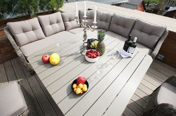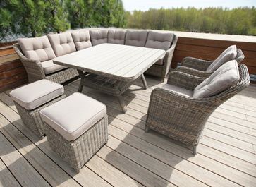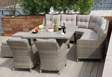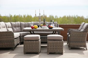 Обеденный комплект из искусственного ротанга Сорренто состоит из углового дивана, обеденного стола, 2-х кресел и 2-х пуфов. Подушки в комплекте. Материалы: искусственный ротанг/алюминий/ткань Размеры (ШхГ), мм: Кресло - 580х530 Стол - 1400х1400 Пуф - 450х520х450 Цвет: как на фото Минимальная сумма заказа 1000 рублей. Страна производства: Китай Возможен самовывоз.