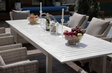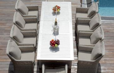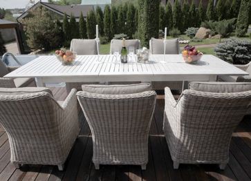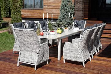 Обеденный комплект из искусственного ротанга Toscana состоит из раскладного обеденного стола и 8-ми кресел с подушками. Материалы: Стол: каркас - алюминий столешница - алюминий Кресло: плетение - искусственный ротанг каркас - алюминий Размеры (ШхВхГ), мм: Кресло - 620х905х710 Стол - 2170(2770)х755х1000 Цвет: как на фото Минимальная сумма заказа 1000 рублей. Страна производства: Китай Возможен самовывоз.
