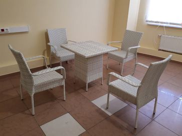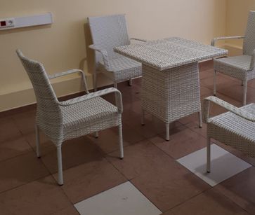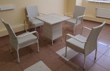 Обеденный комплект из искусственного ротанга Венеция A001 состоит из обеденного стола и 4-х кресел. Столешница ротанг+ стекло Материал - искуственный ротанг Каркас - металл Размеры (ШхВхГ), мм: Кресло - 600х920х420 Стол - 700х750х700 Цвет: светло-серый Кресла стопируются Минимальная сумма заказа 1000 рублей. Возможен самовывоз.
