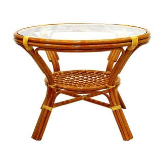 Стол выполнен из натурального ротанга, цвет белый, коньяк или кофе, произведено в Индонезии.- размеры стола: диаметр 104 см., высота 76 см., стеклянная столешница.