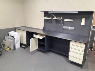 Верстак металлический 3560х600х900/1800мм (ШхГхВ), на металлическом каркасе из профильной трубы. Столешница: фанера 24мм, покрыта листом нержавеющего металла 1мм (марка AISI 430), на столешнице справа установлен защитный экран 2000х200х900мм (ШхГхВ) из перфорированного листа металла с лампой дневного освещения и полкой сверху. Экран комплектуется 2-мя подвесными полками, держателями отверток и ключей, навесными крючками 100мм (20 шт.). В левой части столешницы установлена мойка из нержавеющей стали. Верстак разделен на две зоны: