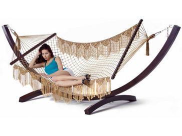 Гамак сетка №6 связан ручным способом, в два каната из синтетической полиамидной нити, которая обладает высокой прочностью и не изменяет своих свойств при различных погодных условиях.Планки для гамака выполнены из дерева - бук. Поэтому гамак прослужит долго, т.к. полиамид, и бук – материалы надежные и крепкие.Все полотно украшено бахромой, связанной в технике макраме, что придаёт гамаку изящный вид.