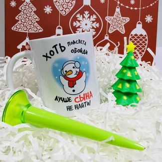 <p>В наборе:</p> <ul> <li>Кружка с надписью Хоть полсвета обойди, лучше сына не найти. Емкость 330 мл. Высота - 95мм. Диаметр - 82мм.</li> <li>Ручка шариковая Елка. Высота 16,5 см, диаметр 1,8 см. Материал: пластик, силикон</li> <li>Коробка размер:&nbsp;16х15х8 см</li> <li>Бумажный наполнитель</li> </ul> Наличные, безнал., карты, эл. деньги, юр. лица Возможен самовывоз. Есть доставка.