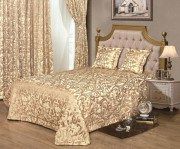 Буйство фактурных завитков из золотистых нитей на молочно-золотом глянцевом фоне покрывала оживит даже самую скучную обстановку! Шторы того же дизайна украсят окно непрерывным мерцанием из золота.