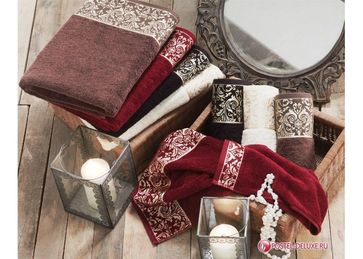 Коллекция Жаккардовых полотенец выполнена с золотым и серебряным орнаментом. Благородные тона черного, темного шоколада, бордо и крем- создают уют и подчеркивают лучшие качества махровой ткани. В коллекции представлено ручное и банное полотенце