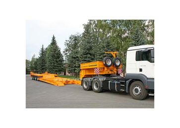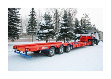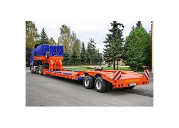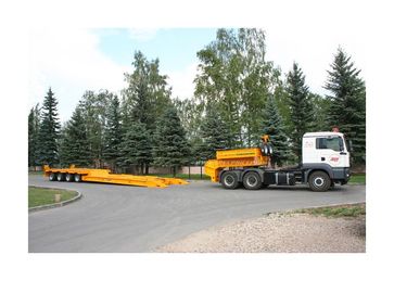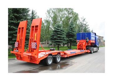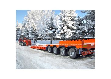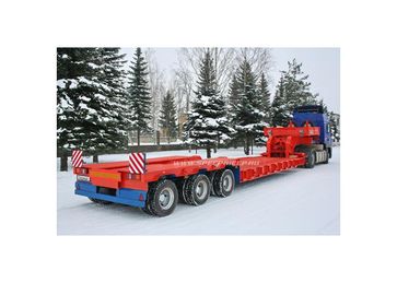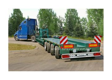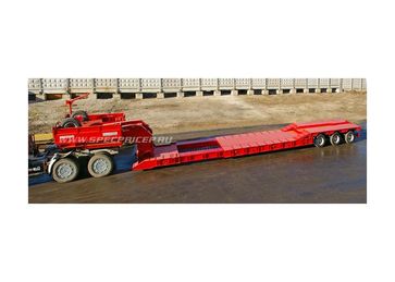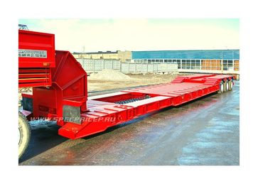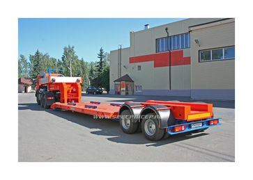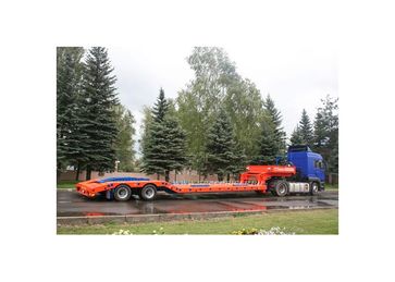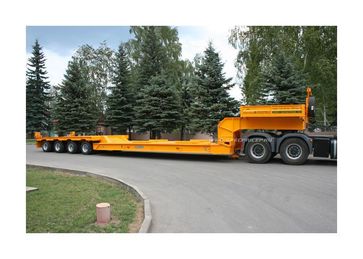количество осей – от 1 до 6, грузоподъёмность – от 10 до 75 т, погрузочная высота – от 400 до 850 мм. Их предназначение - перевозка любых моделей дорожно-строительной техники (ДЭКов, РДКа, фрез, катков, асфальтоукладчиков, агрегатов Roadtec для рецикла асфальта и т.д.). Для такой техники, тяжелой, с малым клиренсом, лучше всего подходит передний заезд. Гусак отстегивается (на запланированные сцепку/расцепку затрачивается чуть более 1 минуты) и техника заезжает с земли прямо на платформу под минимальным углом. При этом соблюдается исключительная безопасность погрузочно-разгрузочных работ: техника, даже соскальзывая с погрузочной платформы, не упадет, не перевернется, а лишь сместится на землю. Предусмотрена возможность повышения или понижения клиренса в передней части полуприцепа ± 200 мм (за счет изменения положения гусака). Положение задней части рамы изменяется при помощи усиленной пневматической подвески (± 100 мм). Особого внимания заслуживают низкорамные полуприцепы с отстегивающимся гусаком, в конструкции которых может быть реализован механизм раздвижки рамы как в продольном направлении (до 3 м), так и поперечном (на 1 м). Это универсальное решение для транспортирования различных грузов, которые легко размещаются на средней части полуприцепа (выдвижная часть рамы является несущим элементом). Полуприцепы с отстегивающимся гусаком задумывались как транспортные средства, работающие на дорогах общего пользования, часто в стесненных условиях улиц современных городов. Поэтому актуально стало оснащение их автоматическим гидравлическим управлением с принудительно управляемыми осями для уменьшения радиуса поворота автопоезда. При повороте полуприцеп вписывается в коридор, соответствующий современным европейским нормам и правилам. Таким образом мы обеспечили высокие показатели маневренности, управляемости и устойчивости этих моделей в различных условиях движения.