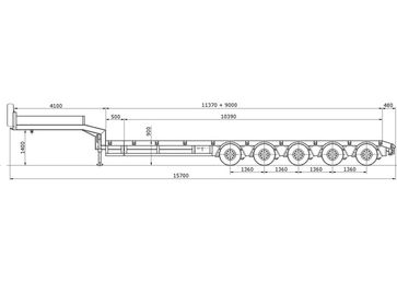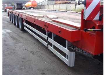 Низкорамный полуприцеп с телескопическим раздвижением (трал) 5-ти осный,предназначен для перевозки негабаритных и тяжеловесных грузов.Шаг выдвижения телескопической балки 500 мм. Полуприцеп оборудован: бортовой площадкой на гуське; утапливаемыми скобами для крепления груза по периметру платформы; карманами для съемных стоек 100 х 100 по периметру платформы.