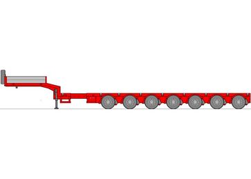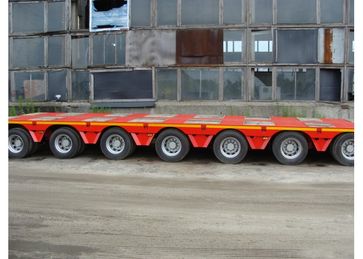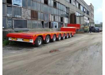 ШАССИ: Сварная конструкция из продольных и поперечных балок, изготовленных из стали, опорная плита с соединительными 2 и 3,5 дюймовыми шкворнями JOST, 2 х 12 тонн переднее опорное устройство с односторонним управлением справа JOST, 2 противооткатных упора с держателям, держатель для крепления запасных колес, бортовая площадка на гуське.Угол скосов на гуське и на платформе 15 градусов, возможно изготовление без скосов. ОСЕВОЙ АГРЕГАТ: Оси 7х12000 кг, пневмоподвеска, BPW, SAF или GIGANT усиленное исполнение для тяжелых дорожных условий, оснащение датчиками ABS.3-я, 4-я и 5-я оси стационарные,1-я, 2-я и 6-я, 7-я оси подруливающие с краном фиксации при движении задним ходом, оси также блокируются при включении передачи заднего хода. Три передних оси подъемные с одним краном управления. КОЛЕСА И ШИНЫ: 30 колес (включая 2 запасных), диск 17,5 х 6