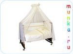 Комплект состоит из 5ти метрового балдахина, пышного бортика из 4х частей высотой 50см на весь периметр кроватки, одеяла (размер 110х140 см), пододеяльника, подушки (размер 40х60 см), наволочки и простыни на резинке. None