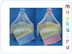 Комплект 7 предметов: балдахин - сетка 1,8м4м, охранный бампер на молнии (съемный чехол) 4м0,40м, одеяло 1,45м1,10м, пододеяльник 1,45м1,10м, наволочка 0,60м*0,40м, подушка, простыня на резинке. Ткань - супер-коттон (нежный хлопок), наполнитель холофайбер. None