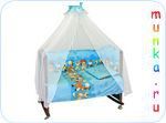 Бортик (раздельный на 4 стороны, высота 50см, синтепон, 120х60см) Балдахин (сетка, бязь, 175х450см) Наволочка 40х60см Пододеяльник 110х140см Простыня 140х100см Одеяло (110х140см, шерсть 80%, ПЭ 20%) Подушка (40х60см, шерсть 80%, ПЭ 20%) Ткань:бязь 100 % хлопок None